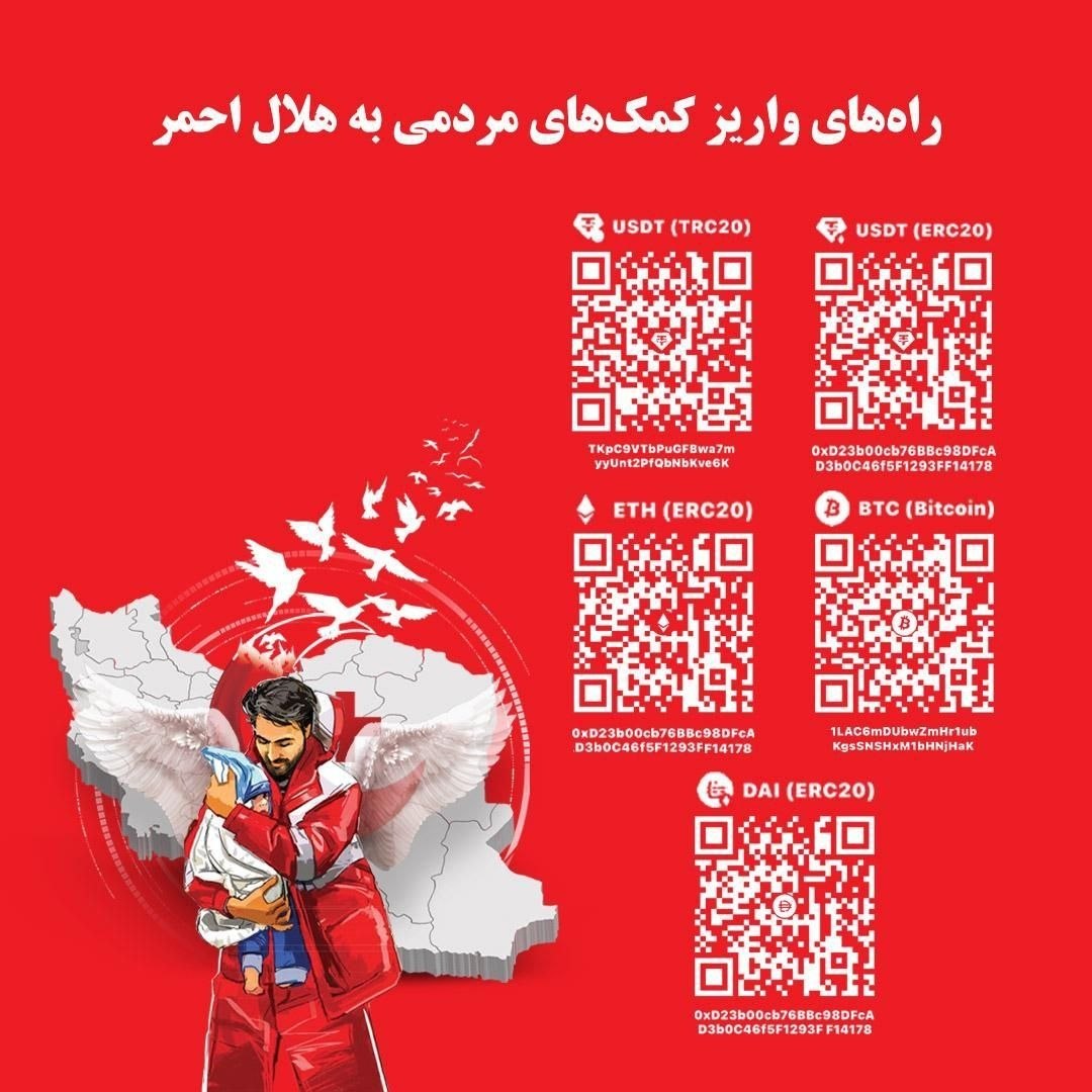 با توجه به مراجعات حضوری و درخواست های تلفنی و ایمیلی شمار زیادی از ایران دوستان عزیز برای کمک های نقدی در بازسازی مدارس، بیمارستان‌ها و منازل مسکونی آسیب دیده از تجاوز آمریکا و رژیم غاصب اسرائیل علیه کشورمان، بدینوسیله بارکدهای رسمی رمز ارزی اعلام شده توسط جمعیت هلال احمر جمهوری اسلامی ایران در تصویر بالا جهت مشاهده و اقدام اعلام می‌گردد: